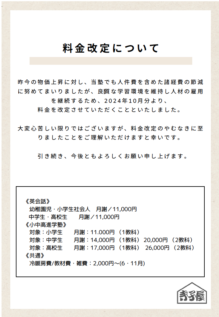 昨今の物価上昇に対し、当塾でも諸経費の節減に努めてまいりましたが、2024年10月分より、料金を改定させていただくことといたしました。